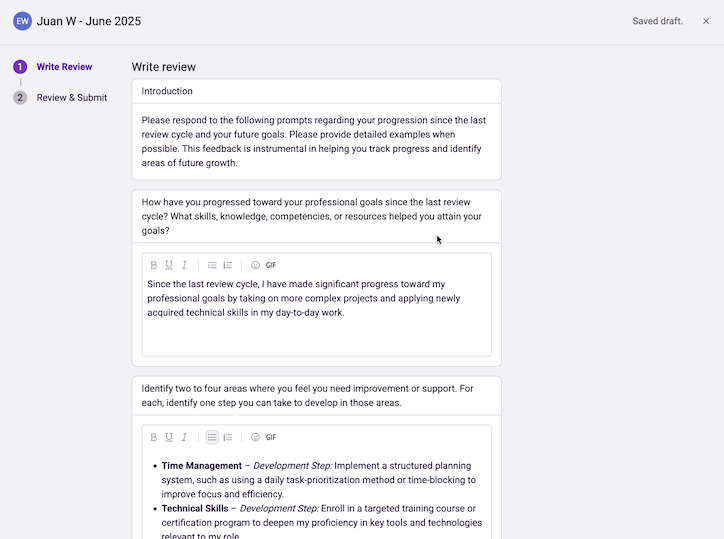 Completeting a review is simple and straightforward. Users are guided through a series of admin curated questions to provide meaningful feedback.