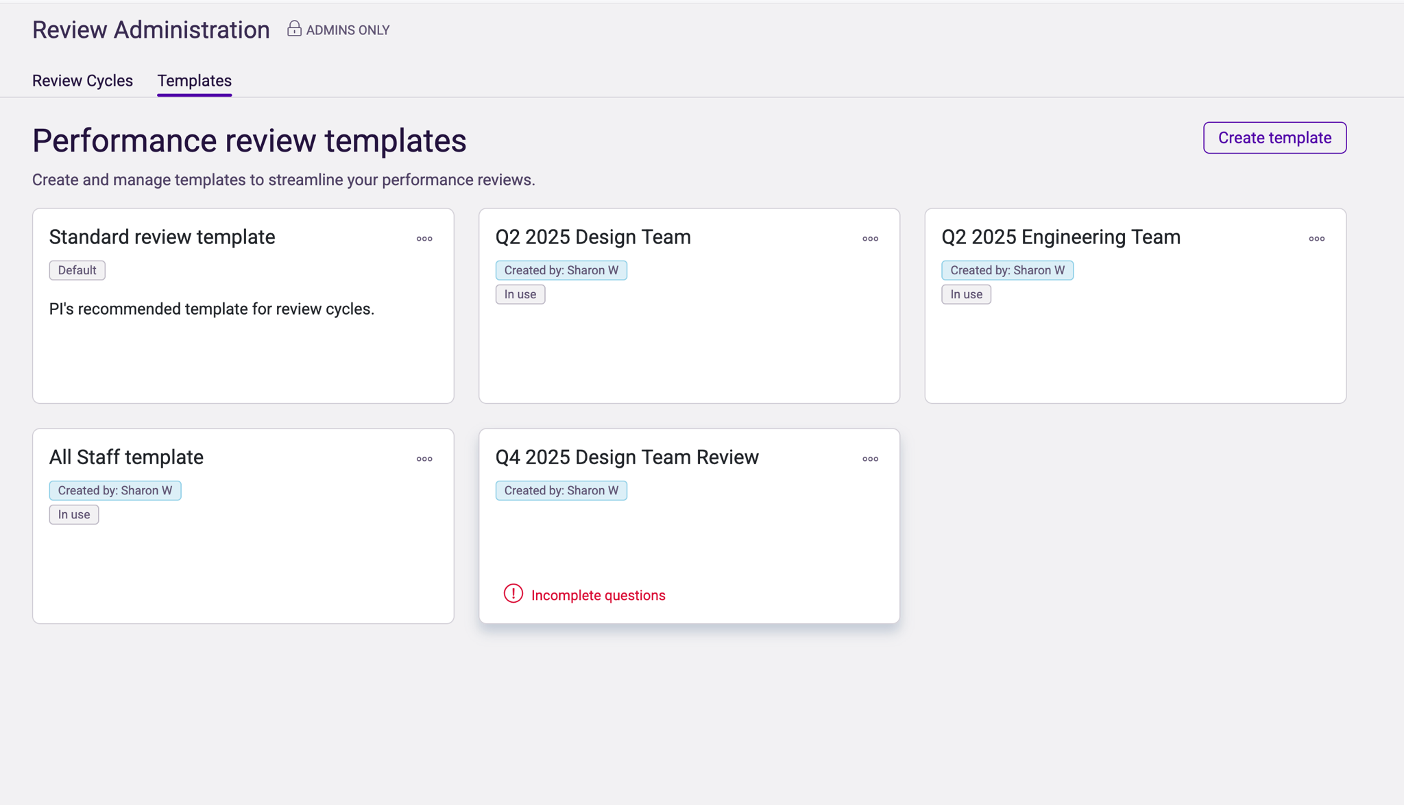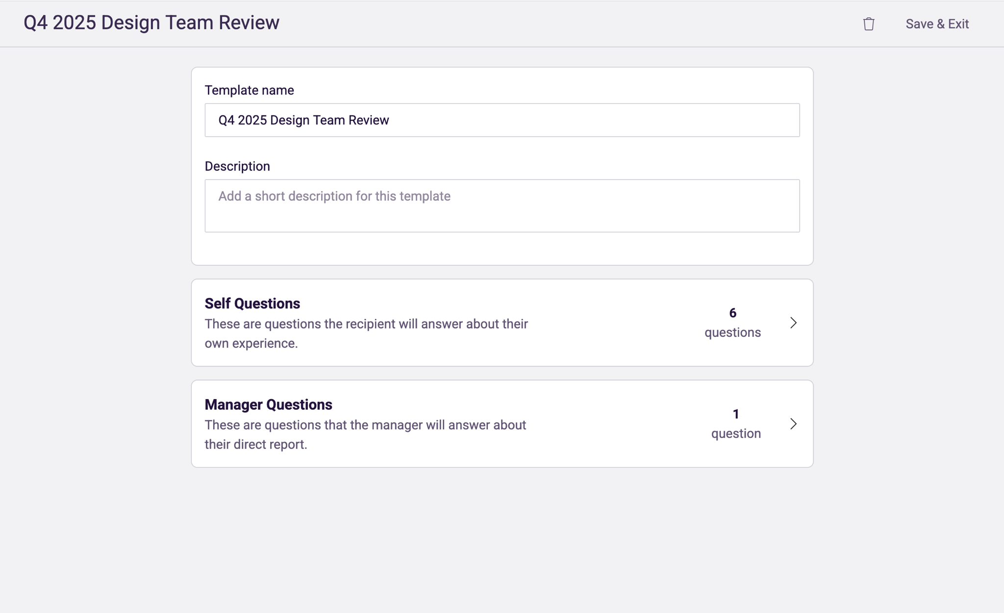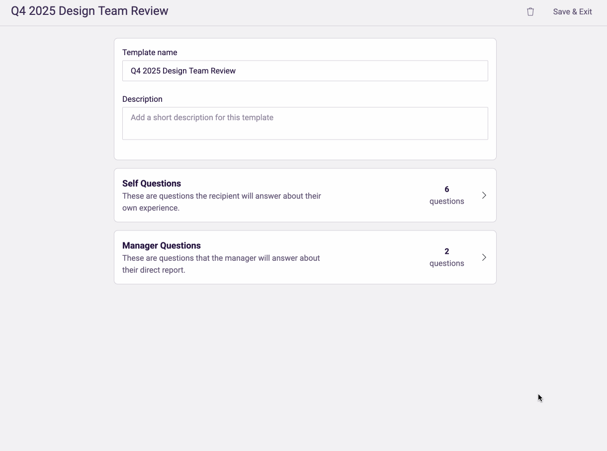 To help admins get started quickly, we provide a gallery with a pre-built template that can be used as-is or customized to fit their needs. Using our easy template builder, admins can create custom questions with various answer types including multiple choice, rating scales, and open text responses.