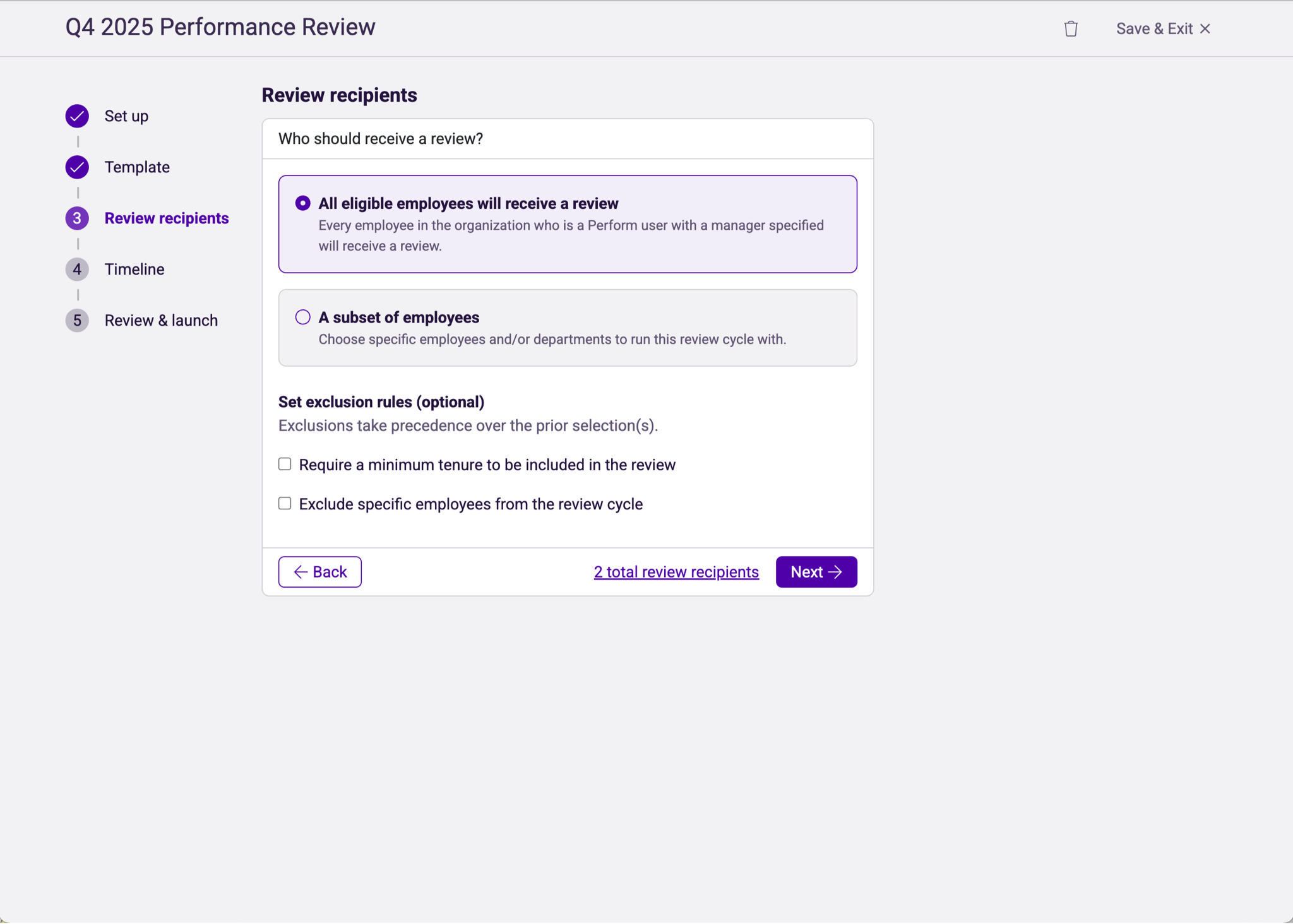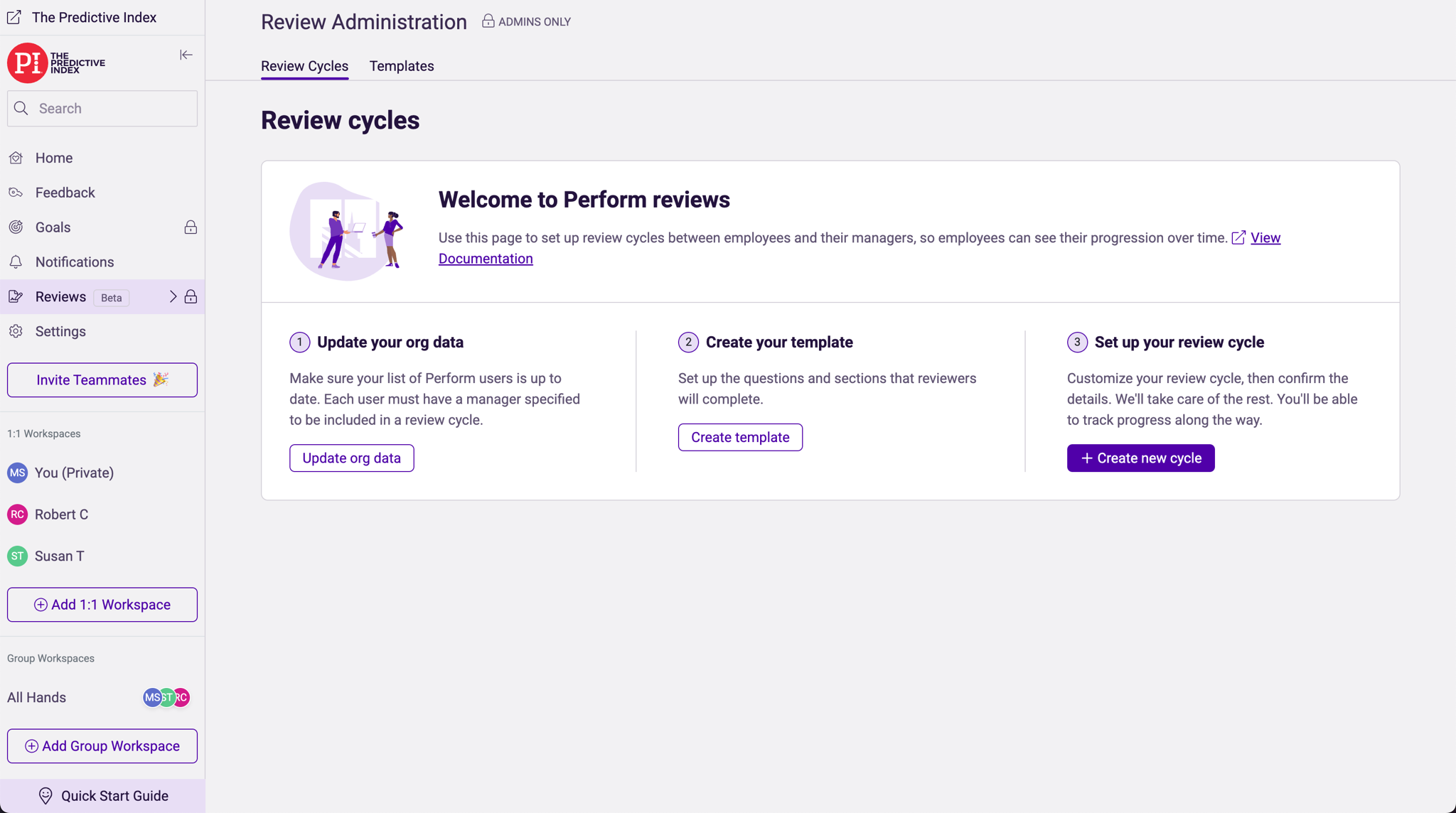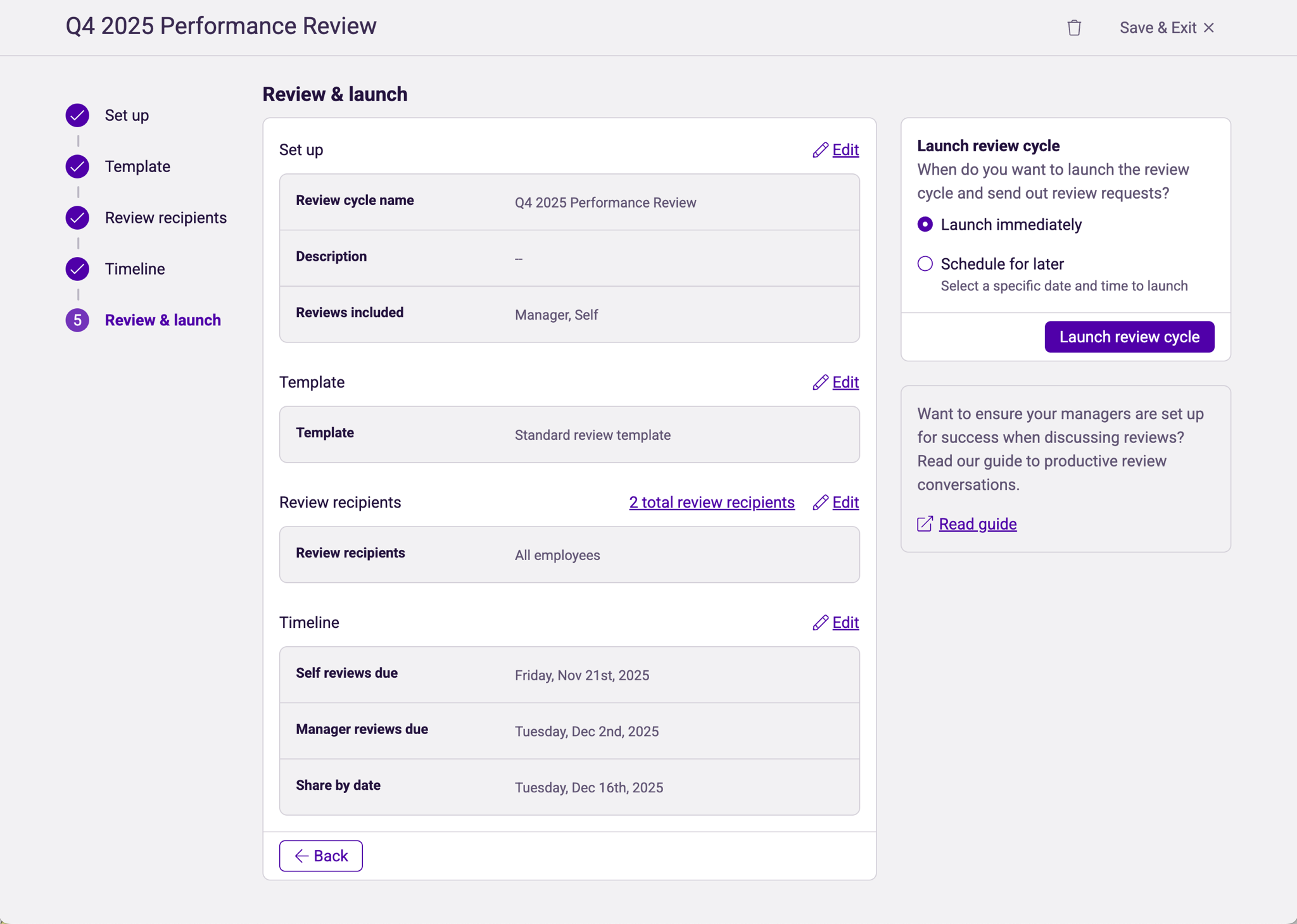 Using our guided steps, an HR admin can either launch or schedule a review cycle in just a couple quick minutes.